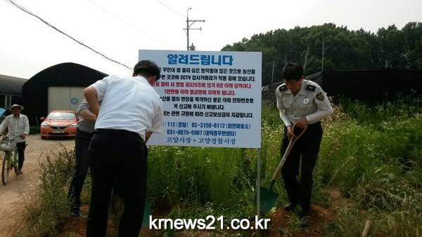 고양경찰서(서장 정수상)는 6. 16일 관내 현천동 일대에 행락철 농작물 절도 예방을 위해 특별순찰구역을 지정하고, 플래카드 및 경고 문구판을 설치하는 등 적극적인 치안활동을 펼치고 있어 좋은 반응을 얻고 있다.