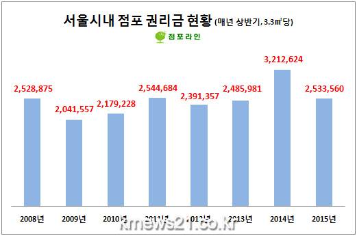 자영업자 간 점포거래소 점포라인이 2008년부터 2015년까지 매년 상반기에 매물로 나온 점포매물 7만775개를 조사한 결과, 올 상반기 권리금은 3.3㎡당 253만원으로 지난해 같은 기간에 비해 21.14% 떨어진 것으로 나타났다.