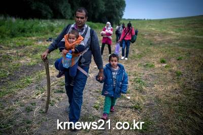 시리아 이민자가 헝가리 국경을 향해 걸어가고 있다.