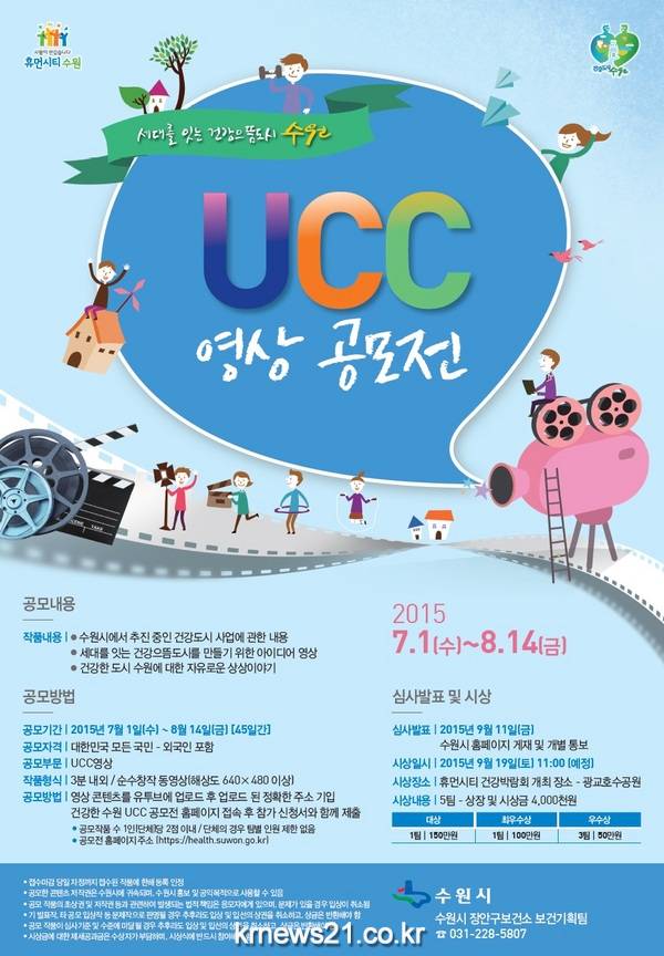수원시는 건강도시 수원을 홍보하고 시민들의 건강의식을 높이기 위해 내ㆍ외국인을 대상으로 내달 14일까지 ‘2015 건강도시 수원 UCC 영상’을 공모한다.