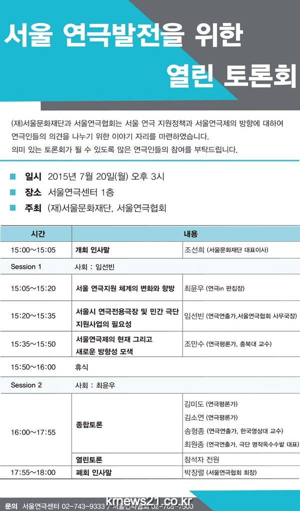 <서울 연극발전을 위한 열린 토론회>는 연극인, 공공기관, 유관기관 관계자들을 비롯해 주제에 관심 있는 일반인은 누구나 참여할 수 있다. 보다 자세한 문의는 서울문화재단 누리집(www.sfac.or.kr) 또는 서울연극센터(02-743-9336)로 하면 된다.