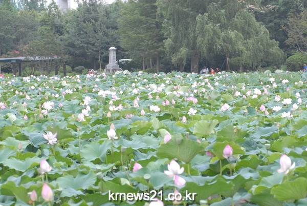 18일 오늘19시 30분 전주연꽃문화축제가 열린 전북 전주덕진공원 전주를 대표하는 도시 호수공원이며 수변에는 연꽃이 빼곡하게 들어차 있는 곳이다.