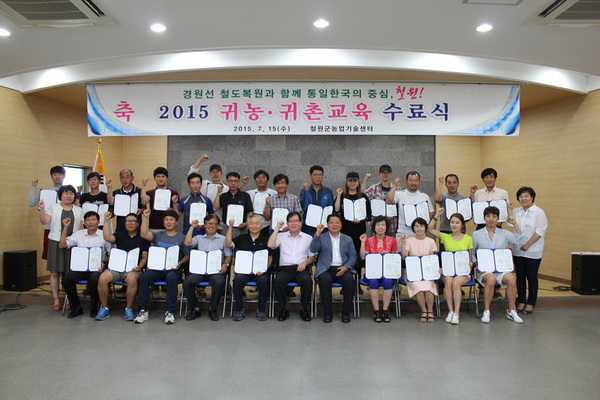 철원군농업기술센터(소장 유재흥)는 지난 15일 농업기술센터 대강당에서 교육생 등 30여명이 참석한 가운데 귀농귀촌교육 수료식을 가졌다.