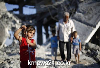 ▲ 팔레스타인 가자지구에서 건물 잔해를 가지고 놀고 있는 한 소녀 ⓒAFP팔레스타인 가자지구에서 한 소녀가 무장정파 하마스와 이스라엘군과의 충돌로 붕괴된 건물 잔해를 가지고 놀고있다.
