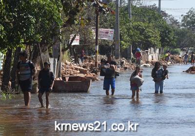 파라과이 아순시온의 빈민촌인 바나도 노르테에서 홍수로 인해 지역 주민들이 물을 헤쳐 지나가고 있다.
