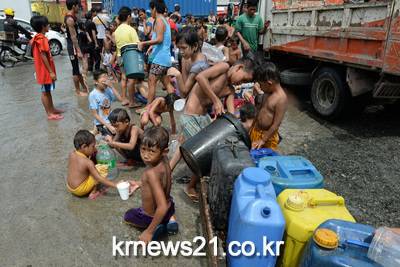 필리핀의 최대 어시장인 피쉬포트에서 소년들이 플라스틱 용기에 물을 채우고 있다.