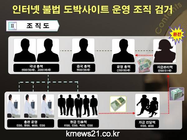 검거된 국내총책 성모 씨(46세, 남) 등은 중국에 있는 도박 사이트 운영자로부터 지시를 받아 하부조직인 ‘본사, ’총판‘, ’매장‘을 두고 관리를 해오면서 사이트를 홍보하기 위해 불특정 다수에게 무작위로 문자 메세지를 보내 회원을 확보한 뒤 수시로 도박금을 입금 받는 계좌를 변경하고, 입금된 도박자금을 200여개의 대포통장으로 분산하여 자금을 세탁한 후 국내 금융기관에서 현금으로 범죄 수익금을 인출하는 치밀함을 보였다.