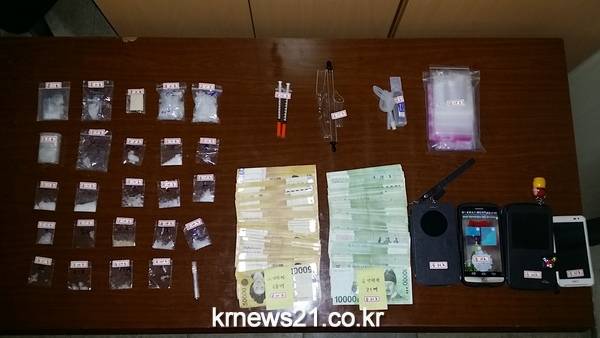 경찰은 필로폰을 구매하여 투약한 김某씨의 가정폭력 신고로 현장에 출동하여 조치 중 방 안에서 1회용 주사기를 발견하고 수사를 벌여 이들 일당을 검거한 것으로 알려졌으며, 이들이 보관하고 있던 필로폰 90.7g과 대마초 5.21g, 마약 판매자금 411만원 등을 압수했다.