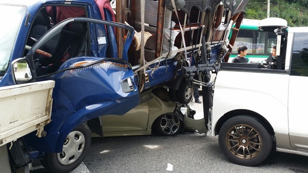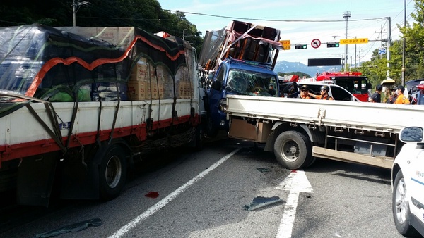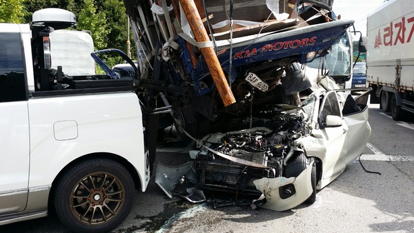 대형 화물차가 브레이크가 밀리면서 신호대기중이던 차량 4대를 추돌하였다.