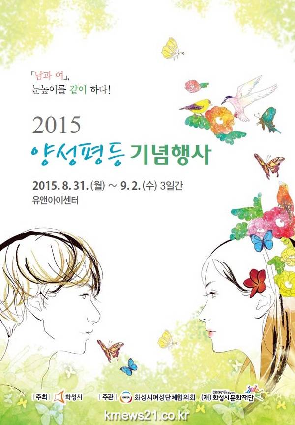화성시는 ‘남과 여, 눈높이를 같이하다!’라는 주제로 오는 8월 31일부터 9월 2일까지 유앤아이 센터에서 ‘2015 양성평등 기념행사’를 개최한다.