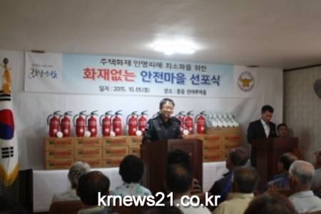 마을주민 70명 등 총 100여명이 참석한 가운데 ▲화재없는 안전마을 선포 ▲명예소방관위촉 ▲화재없는안전마을 현판 제막 ▲단독경보형 감지기 부착 및 소화기 전달 ▲다과회 순으로 진행됐다.
