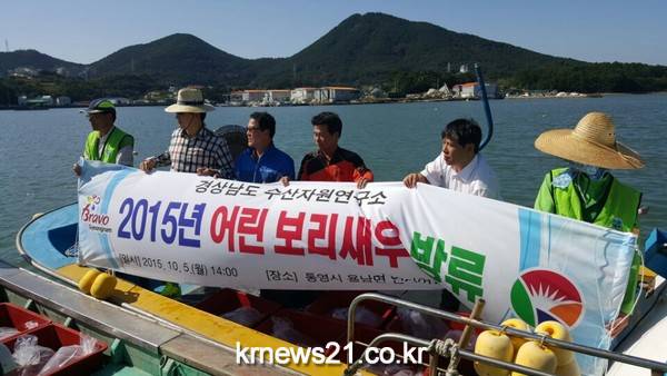 경상남도수산자원연구소(소장 박경대)는 '어업인 소득창출 품종 자원조성'을 위하여 5일, 7일 이틀간 지역 특산 품종인 어린 보리새우 100만 마리를 통영시 용남면 해역과 고성군 고성만 해역에 방류한다고 밝혔다.