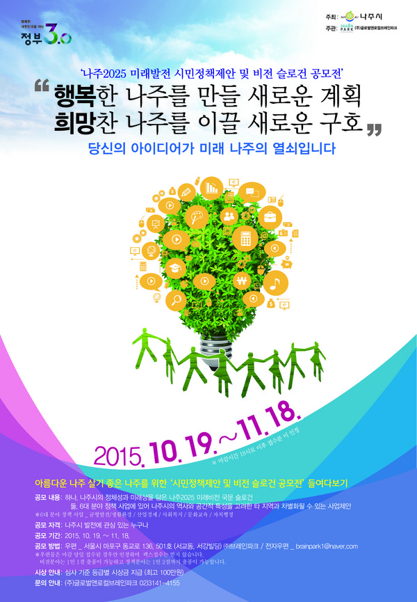 나주시는 나주2025 미래발전 전략 중장기 계획 수립과 연계하여 나주시의 정체성을 반영하고 시민이 공감하는 정책과 비전을 개발하기 위하여 나주시 발전에 관심 있는 전 국민을 대상으로 10월 19일부터 11월 18일까지 ‘나주2025 미래발전 시민정책제안과 비전 슬로건 공모전’을 실시한다.