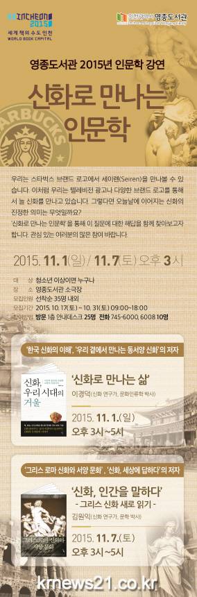 인천 영종도서관(관장 심민석)은 ‘신화로 만나는 인문학’을 테마로, 11월 1일(일)과 7일(토) 오후 3시, 영종도서관 소극장에서 인문학 강연을 개최한다고 밝혔다.