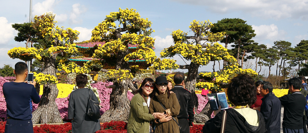 28일 2015 대한민국 국향대전을 찾은 관람객들이 국화 조형물 앞에서 환한 미소로 기념사진을 찍고 있다.