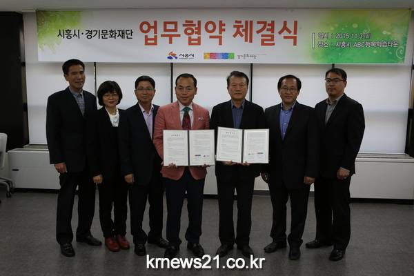 시흥시(시장 김윤식)가 경기문화재단(대표시사 조창희)과 지난 11월 3일화예술 분야에서의 협력관계 구축을 위한 업무 협약식을 개최하였다.