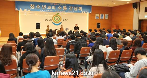 나주시는 19일 오전 시청 회의실에서 시민과 소통하는 나주를 만들기 위해 청소년들이 원하는 사항을 경청하고 나주교육 발전을 모색하는 청소년 소통간담회를 마련했다.