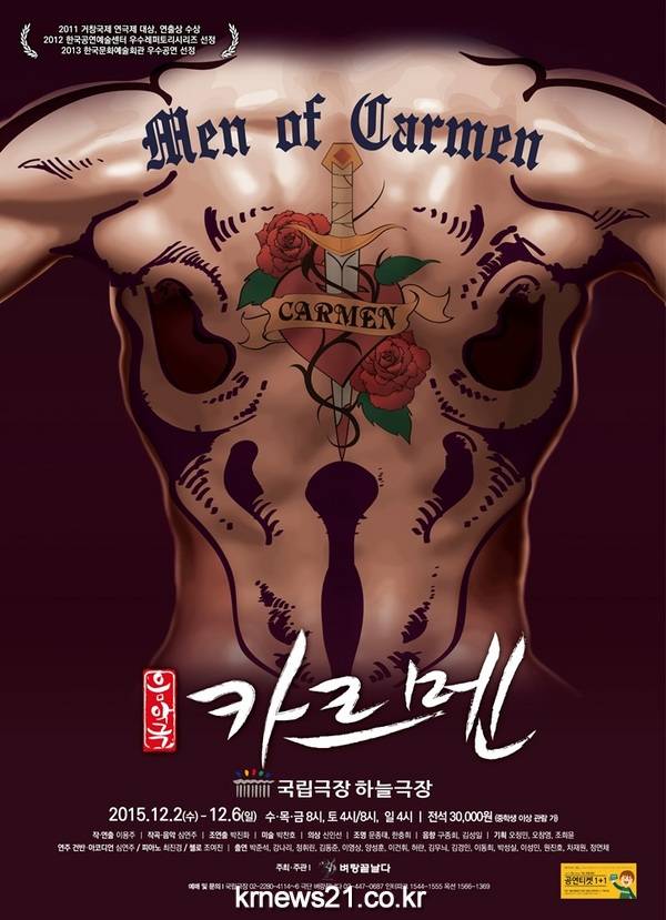 2011 거창국제연극제 대상 및 연출상 수상, 2012 한국공연예술센터 우수레퍼토리시리즈 선정, 2013 한국문화예술회관연합회 우수공연 선정에 빛나는 이 작품은 비제의 오페라 ‘카르멘’이 아닌 원작소설 프로스페르 메리메의 ‘카르멘’에 충실해 비극적 사랑의 파멸을 생생하게 보여준다.