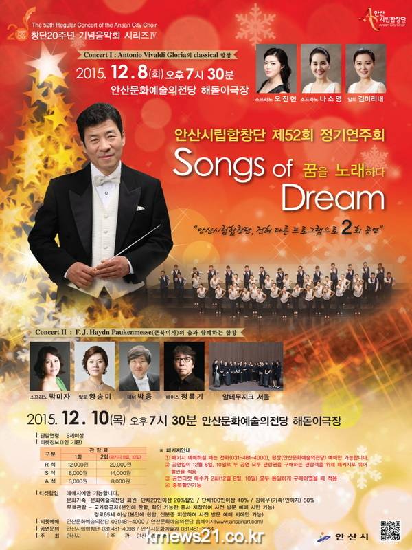 안산시립합창단 제52회 정기연주회 ‘Songs of Dream 꿈을 노래하다’가 오는 12월 8일과 10일 오후 7시30분 안산문화예술의전당 해돋이극장에서 공연된다.