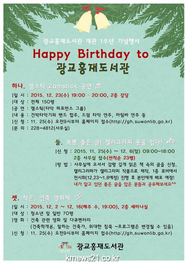 행사 참여 신청은 광교홍재도서관 홈페이지(gh.suwonlib.go.kr)에서 할 수 있다. 캘리그라피 제작 신청은 12월 6일까지 도서관 2층 사무실에서 접수한다. 기타 자세한 사항은 광교홍재도서관 정보봉사 팀(031-228-4812)으로 문의하면 된다.