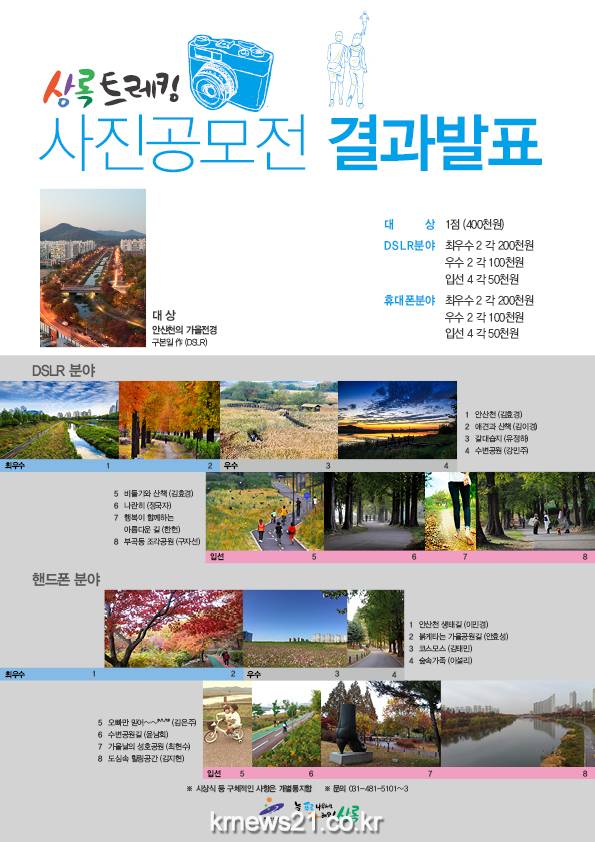 상록구(구청장 박미라)는 걷기 운동을 많이 하는 시민의 관심에 부응하고자 수변 길, 공원길, 숲속 길 등 걷기에 좋은 9개 코스를 장소로 한 ‘상록 트레킹’ 사진 공모전을 지난 10월 12일부터 11월 13일까지 ‘상록트레킹의 멋과 추억’의 주제로 개최했다.