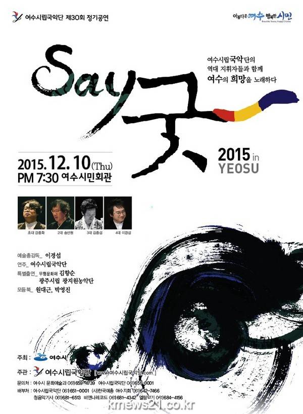 여수시립국악단(상임지휘자 이경섭)은 오는 10일 저녁 7시 30분 여수시민회관에서 제30회 정기연주회로 ‘SAY 굿 2015’ 공연을 갖는다.