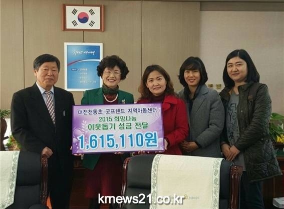 대전천동초등학교(교장 성수자)가 18일(금) 사단법인 굿프랜드에서 운영하는 굿프랜드지역아동센터에 학부모회에서 주관하여 전교생이 고사리 같은 손으로 모은 성금 1,615,110원을 전달하였다.