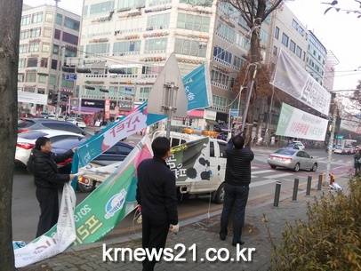 김포시는 경기도옥외광고협회 김포시지회를 비롯한 특수임무수행자회 및 바르게살기 김포시협의회와 합동으로 김포시 전역에서 극심하게 범람하고 있는 불법현수막 및 벽보, 전단 등에대한 불법 광고물과의 전쟁을 선포하고 지난 9일 30여명이 참여한 가운데 대대적인 정비에 나섰다.