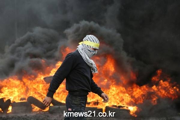 2016년 1월 8일(현지시각) 이스라엘 점령지 쪽 팔레스타인 서안지구(West Bank) 부근 나블루스 근처 카프르카둠(Kfar Qaddum) 마을에서 팔레스타인 시위대와 이스라엘 보안군이 충돌하는 동안 한 시위자가 불길이 치솟는 타이어 주변을 걷고 있다.