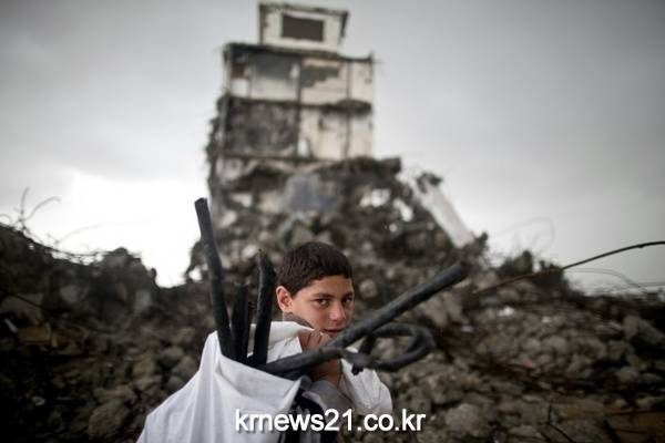 ▲ ⓒAFP / Mahmud Hams겨울 폭풍이 오는 북부 가자지구 베이트 하넌(Beit Hanoun)에서 한 팔레스타인 소년이 2014년 여름 이스라엘과의 전쟁으로 폐허가 된 건물 근처를 걷고 있다.