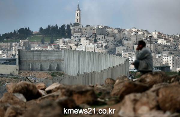 한 팔레스타인 사람이 11일(현지시간) 팔레스타인의 알-투르 지역을 분리시킨 이스라엘의 벽을 바라보며 앉아있다.