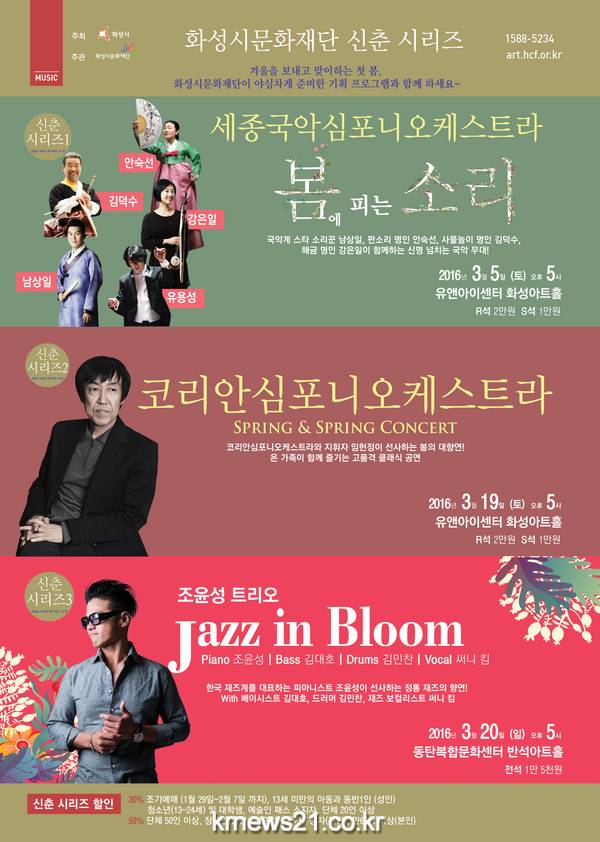 화성시 문화재단은 겨울을 보내고 맞이하는 첫 봄, 화성시민들을 위해 서로 다른 음악적 색을 가진 3편의 신춘 시리즈(국악, 클래식, 재즈)를 3월 한 달 간 선보인다. 음악부문 각 장르를 대표하는 실력파 아티스트의 공연으로 준비된 이번 공연은 화성시민들의 음악적 다양성을 열어주는 계기를 제공할 뿐 아니라 좋은 공연을 저렴한 가격으로 관람할 수 있도록 화성시 문화재단이 야심차게 마련한 기획 공연이다.