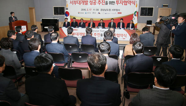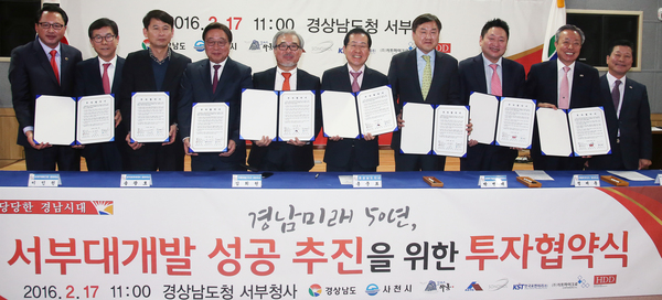 경남도는 17일 오전 11시, 서부경남시대의 중심인 서부청사에서 홍준표 도지사, ㈜에이에스티지 김희원 대표이사, ㈜송월테크놀로지 박병대 대표이사, 한국표면처리㈜ 송광호 대표이사, ㈜카프마이크로 이인권 대표이사, ㈜에이치디디 정제훈 대표이사, 송도근 사천시장, 윤상기 하동군수 등 50여 명이 참석한 가운데 투자협약을 체결하였다.