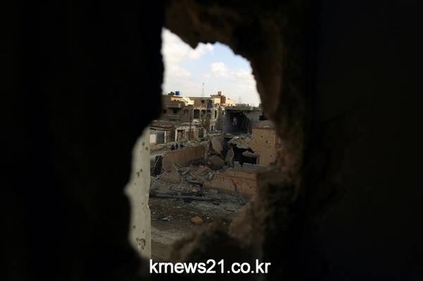 벵가지의 동부 해안 도시의 중앙을 장악한 IS와의 전쟁으로 무서진 건물들
