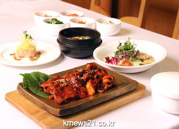 봄 향기 가득한 더덕 샐러드, 따듯한 봄을 담아낸 봄나물 된장찌개와 더불어 래디시 소스를 곁들인 새우 두부선, 쫄깃하고 매콤한 맛의 쭈꾸미와 오겹살 구이로 푸짐한 한 상을 차려낸다.