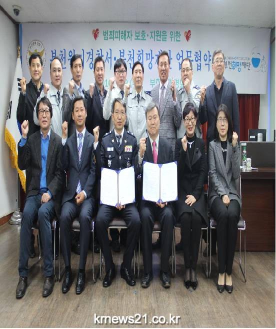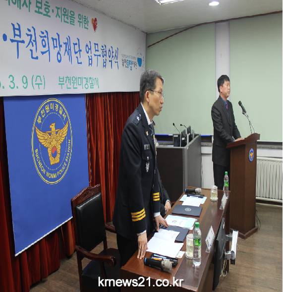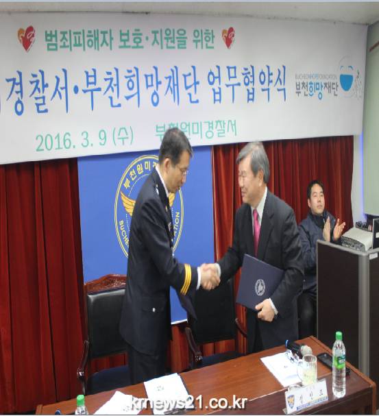 부천원미경찰서(경무관 우종수)에서는 지난 9일 경찰서 2층 소회의실에서 부천희망재단과 범죄피해자보호 · 지원 강화를 위한 업무협약(MOU)을 체결했다."고 밝혔다.