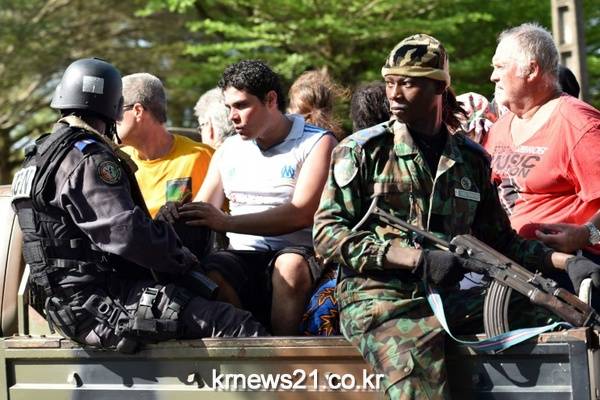 코트디부아르 보안군이 무장 괴한들의 총격으로 인해 휴양지인 그랑바상에 있는 해변 리조트에서 사람들을 대피시키고 있다.