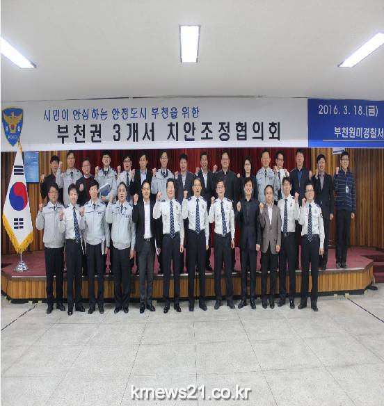 부천원미경찰서(서장 경무관 우종수)에서는 지난 18일(금) 부천지역 3개 경찰서(원미,소사,오정)서장과 각서 지휘부가 참석하는 ‘시민이 안심하는 안전도시 부천을 위한’ 치안조정협의회를 개최하고 치안 정책에 관한 정보를 공유하는 자리를 가졌다."고 밝혔다.