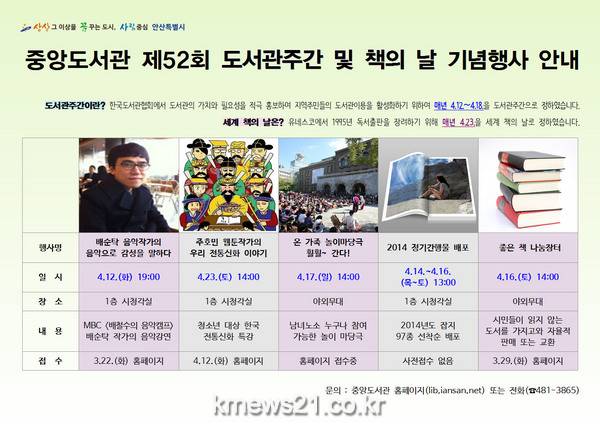 중앙도서관(관장 문양교)은 제52회 도서관주간(4.12.~4.18.)과 세계 책의 날(4.23.)을 맞아 인문학강연, 놀이마당극, 정기간행물 배포, 도서 나눔 장터 등 다양한 독서문화행사를 개최한다고 밝혔다.
