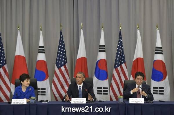31일 박근혜 대통령과 버락 오바마 미국 대통령, 아베 신조 일본 총리는 오전 10시35분부터 오후 1시5분까지 한·미, 한·미·일, 미·일, 한·일 순서로 정상회담을 가졌다.