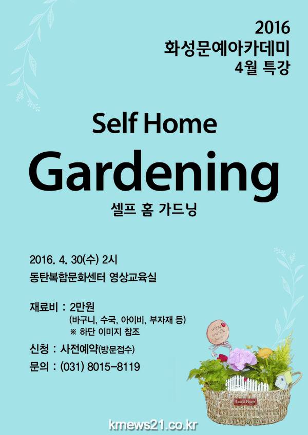 밀폐된 실내공간의 오염된 공기를 정화시키고 봄 향기를 한껏 느낄 수 있는 4월 특강 ‘셀프 홈 가드닝’ 은 한국 컬러디자인 전문학교 파티플라워 강사 역임, 농림수산식품부 장관 배 생활플라워디자인대회 전문부 우수상을 수상하고 국내 유명 특급호텔 및 웨딩홀에서 웨딩플라워 데코를 담당한 플로리스트 조윤민이 ‘베란다에서 느끼는 작은 봄’이라는 주제로 진행한다. 참가비(재료비)는 1인당 2만원이며 가드닝 작업 후 결과물은 모두 개인이 소지할 수 있다. 특강은 4. 30(토) 오후2시 동탄 복합 문화센터 영상교육실에서 진행되며 사전 예약(방문접수)을 통해 수강신청을 받는다.