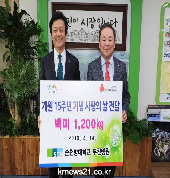 이번 사랑의 쌀은 순천향대학교 부천병원 개원 15주년 기념으로 화환대신 받은 것이다.