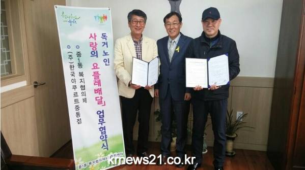 이날 협약으로 중1동 복지협의체는 관내 홀몸어르신 15명에게 CMS 후원금으로 올해 연말까지 요플레를 무료로 제공한다."고 밝히고, 또 한국야쿠르트 중동지점은 주3회 홀로 사시는 어르신 가정을 방문해 요플레를 배달하며 안부를 확인하고 위급 한 상황발생 시 동 주민센터에 신속히 알려준다.
