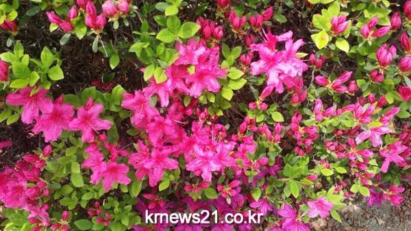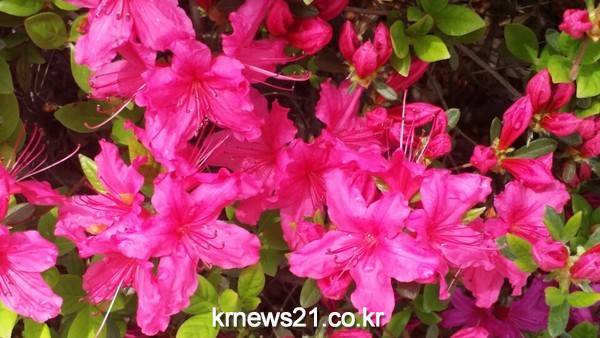 철쭉은 5월에 피고 연분홍색이며 3∼7개씩 가지 끝에 산형꽃차례를 이룬다. 꽃받침은 작은꽃줄기와 더불어 선모가 있다. 화관은 깔때기 모양이고 5개로 갈라지며 위쪽 갈래조각에 적갈색 반점이 있다. 수술은 10개, 암술은 1개이며 씨방에 선모가 있다.