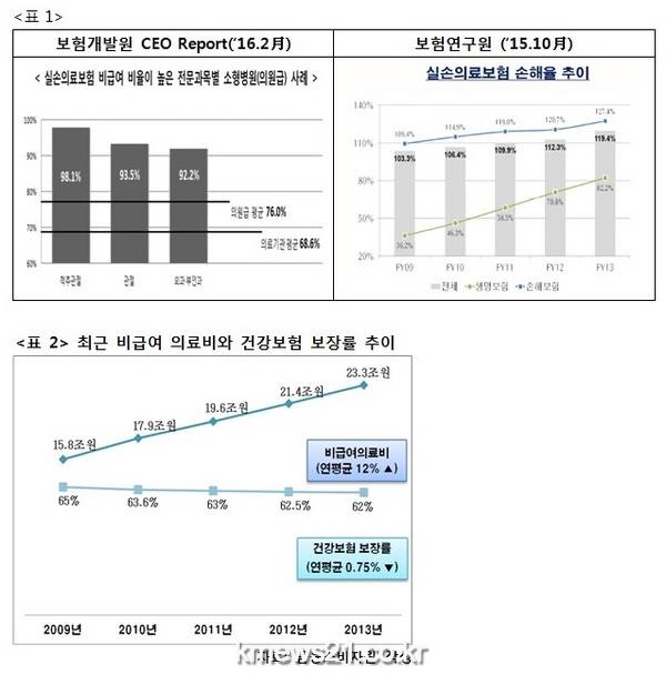 실손의료보험은 국민건강보험이 보장하지 않는 ‘비급여’ 진료 항목 등을 보험사가 보장해 주는 상품으로, 이 보험에 가입하면 국민건강보험과 실손의료보험으로 대부분 병원비를 보장받는다. 3,200만 명이 가입하고 있어 이미 제2의 국민건강보험으로 불리고 있는 실손의료보험은 최근에 보험료가 대폭 인상(4대 손보사 : 18~27%, 3대 생보사 : 22~23%)되었다. 보험사들은 손해율이 급등하여 불가피하다는 것으로 가입자들이 낸 보험료보다 보험사들이 지급한 보험금이 더 많았다는 것이다. (손해율 : 2011년 122%, 2012년 126%, 2013년 131%, 2014년 138%)