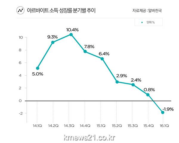 우리나라 올해 1분기 아르바이트 시장 소득 성장률이 -1.9%로 조사이래 처음으로 마이너스 성장률을 기록했다.
