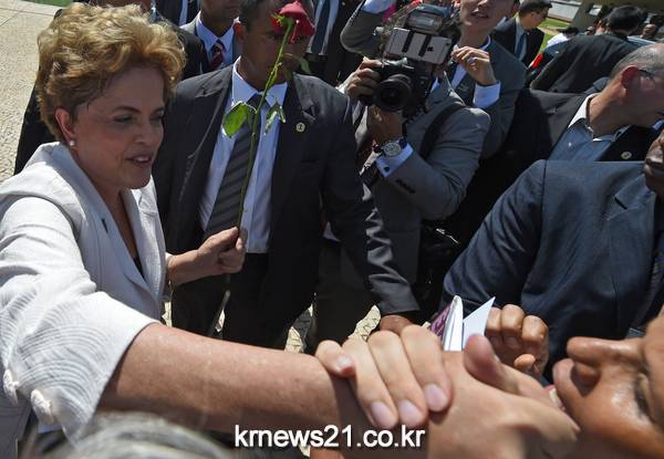 ▲ ⓒVANDERLEI ALMEIDA / AFP대통령 궁을 나오면서 지지자들의 손을 잡는 지우마 호세프 대통령