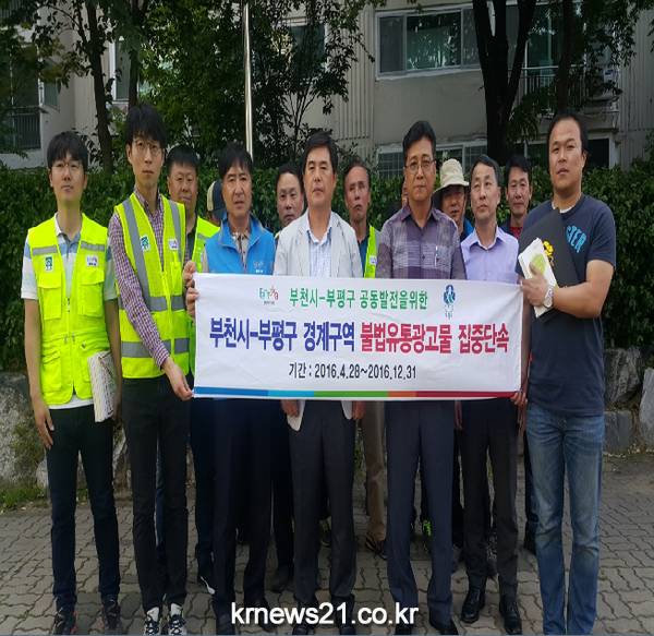 부천시와 부평구는 쾌적한 가로환경 조성을 위해 불법광고물 사각지대인 시 경계지역을 함께 단속하기로 했다."고 밝혔다.