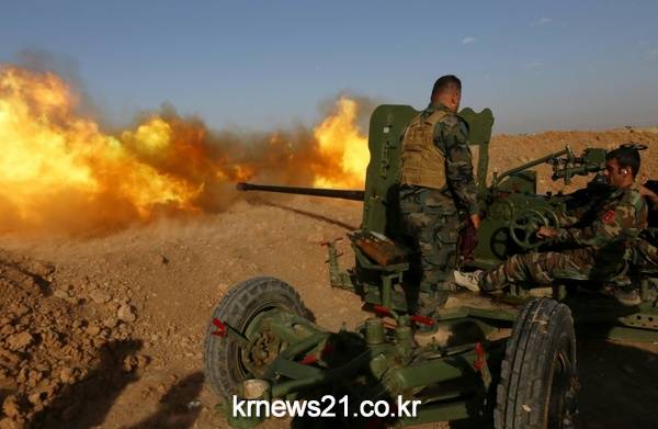 이라크 소수민족 쿠르디스탄의 민병대가 IS가 차지한 지역을 재탈환하기 위해 하산 샴(Hasan Sham) 마을 근처 최전선에서 탱크 대포를 발사하고 있다.
