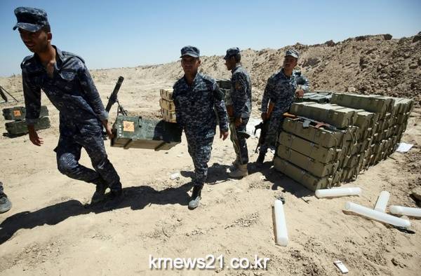 이라크 정부군이 미국 주도 연합군의 항공 지원을 받아 IS가 점령하고 있는 팔루자 탈환 작전을 수행하는 동안, 팔루자 외곽에 박격포 포탄 상자를 운반하고 있다.